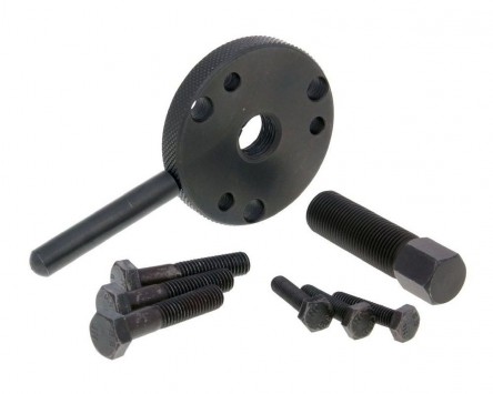 Universell einsetzbarer Abzieher für das Polrad der Lichtmaschine oder den Anlasserfreilauf verschiedener Motorroller. Wird für Arbeiten an der Lichtmaschine, darunter liegenden Bauteilen und bei Kurbelwellen- oder Lagerwechsel benötigt.