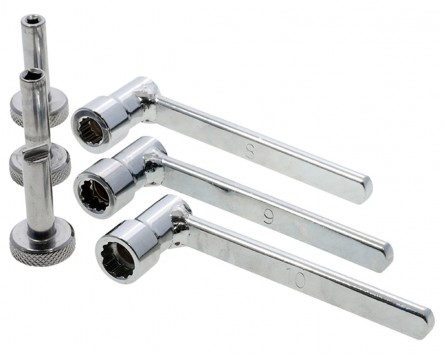 Dieser Einstellwerkzeug Satz enthält 3 Sechskantschlüssel (8, 9 und 10mm) sowie 3 Einstelleinsätze mit 1 x Schlitz, 1 x 3mm Vierkant und 1 x 4mm Vierkant.