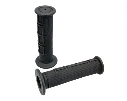 Schwarze Griffgummis im klassischen Motocross-Design für alle Roller, Mopeds und Motorräder mit 22mm Lenker und Drehgasgriffhülse.