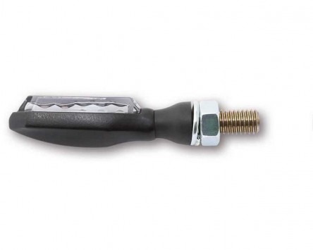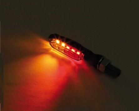 HIGHSIDER LED Rücklicht / Blinker SONIC-X1Sehr kleine Rücklicht- Blinker Einheit in einem hochwertigen schwarzen Metallgehäuse mit getöntem Glas. Mit 5 kraftvollen SMDs werden die 3 Funktionen Blinken, Fahrlicht und Bremslicht dargestellt. Maße: B. 44 mm x H. 13 mm x T. 15,5 mm (mit Linse gemessen).Gummiarm: D. 13 mm, L. 11 mm.Bolzen M8 x 1.25 mm, Länge ca. 20 mm.Anschlüsse:schwarz = Masseblau = Blinkergelb = Fahrlichtrot = BremslichtPassende Blinker: Art.Nr. 204-270.Einbauort: hinten
