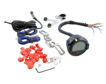 Das D64 DL-03SR Tachometer mit LCD Display in schwarz von KOSO verfügt über viele Funktionen wie z.B. Geschwindigkeitsmesser, Drehzahlmesser, Tankanzeige und viele weitere Funktionen. Zudem sind unter der Anzeige noch 5 Signalleuchten verfügbar, welche für Blinker, Fernlicht, EOBD, Öl und Neutral aufleuchten, falls die entsprechenden Signale ausgelöst werden. Außerdem lässt sich statt des Drehlzahlmessers auch eine Volt- und Tankanzeige anzeigen, welche durch ein blinkendes Symbol auf einen knappen Kraftstoffstand aufmerksam macht. Das Tacho verfüg außerdem über eine Straßenzulassung und kann universell auf Motorrädern, Rollern, Mopeds, Quads und ATV´s verwendet werden.