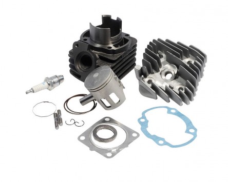 - Lieferumfang: Zylinder, Zylinderkopf, Kolben, Kolbenbolzen, Kolbenbolzenclips, Kolbenringe, Dichtsatz, Auspuffstehbolzen, Zündkerze NGK BR9HS