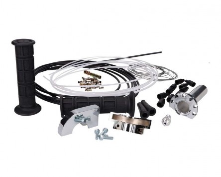 Universelles Gasgriffset bestehend aus verchromter Gasgriffhülse inkl. Einstellschraube, Gaszug-Kabelset und Griffgummi Satz im Halbwaffel-Design.