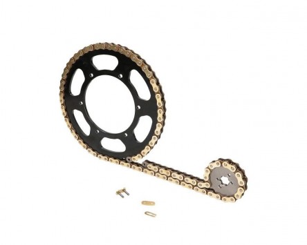 Kettensatz mit verstärkter 420er Antriebskette und Werksübersetzung. Es wird eine Kette mit 140 universalen Gliedern geliefert. Damit sind alle notwendigen Kettenlängen abgedeckt. Es muss auf die Länge der Originalkette gekürzt werden.