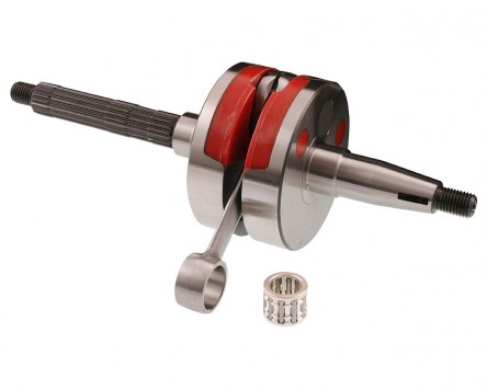 "Vollwangen" - Kurbelwelle von Naraku. Diese Bauweise erhöht die Vorverdichtung im Kurbelgehäuse. Damit wird der Füllgrad im Zylinder verbessert und die Leistungsdrehzahl verlagert sich in den oberen Bereich. Die Vollwangen an dieser Welle sind aus Kunststoff gefertigt, womit das Gewicht der Welle nur unwesentlich erhöht wird. Damit kann diese Welle auch probemlos in 50 ccm Motoren eingebaut werden kann.