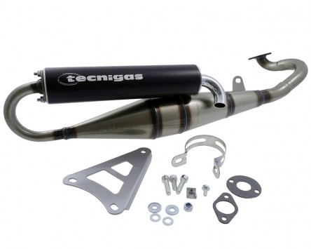 Der Tecnigas NEXT-R ist wohl einer der bekanntesten Sportauspuffanlagen auf dem Markt. Als Nachfolger des erfolgreichen Tecnigas NEXT blickt der Hersteller mit diesem Modell auf eine jahrelange Erfahrung zurück. Der Resonanzkörper besteht nun aus vier statt drei Konen und die Leistungsentfaltung ist dadurch noch harmonischer geworden. Der NEXT-R ist ein sehr guter Allrounder und bietet sehr gute Leistungswerte auf 50ccm als auch auf 70ccm Sportzylinder. Für die Straßenzulassung ist der Auspuff mit einem Trichter im Krümmer als Drossel versehen und läuft damit ähnlich wie ein Original Auspuff.